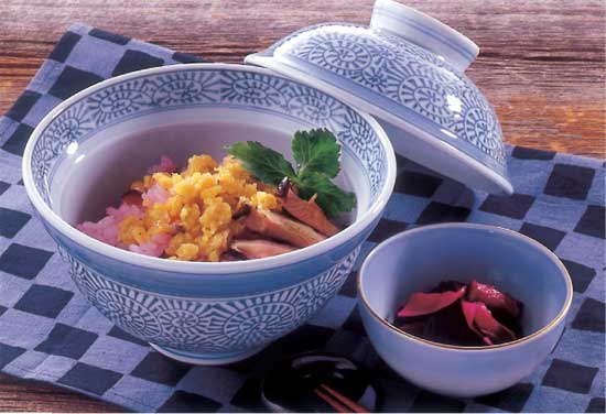 炊き立てのご飯にしば漬と漬け汁を混ぜ込み、椎茸を加えてさっくり合わせ、器にもって煎り卵をのせる。